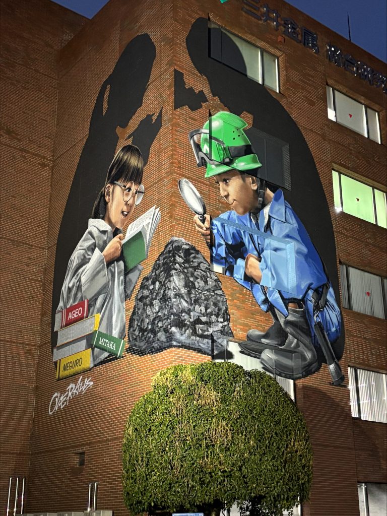 「埼玉県上尾市の総合研究所に、今と未来を象徴し社員の働く姿を表現した壁画を施すイベントを行いました。夜はライトアップされ、描かれている影によって壁画がより際立ちます。壁画が地域のシンボルとなり地域の皆さまに壁画にこめた会社と社員の想いを発信していけたらと思います。」
