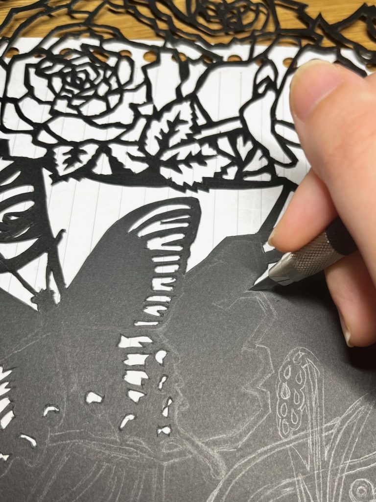 A. 100周年を記念した切り絵の作成です。影絵作家の藤城清治さんの作品を改めて拝見し、感銘を受け切り絵作成に挑戦しました。信託・当社の歴史を調べ、モチーフに伝えたい想いを込めました。「想いを託す」というテーマを、「世界へ花を手渡す姿」へ変換するとともに、当社のカラーを蝶のモチーフで表現したところがこだわりです。